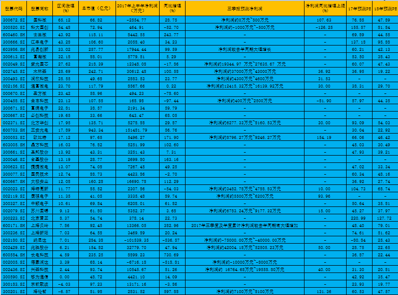 除去7家未有券商给出净利润预测的个股,其余31只个股中,有16只2017年预测市盈率已经超过50倍,而即使考虑到A股往往在三季报公布后会进行“估值切换”,2018年预测市盈率超过40倍中枢的也达到了15只,似乎在一定程度上已经透支了未来的业绩。