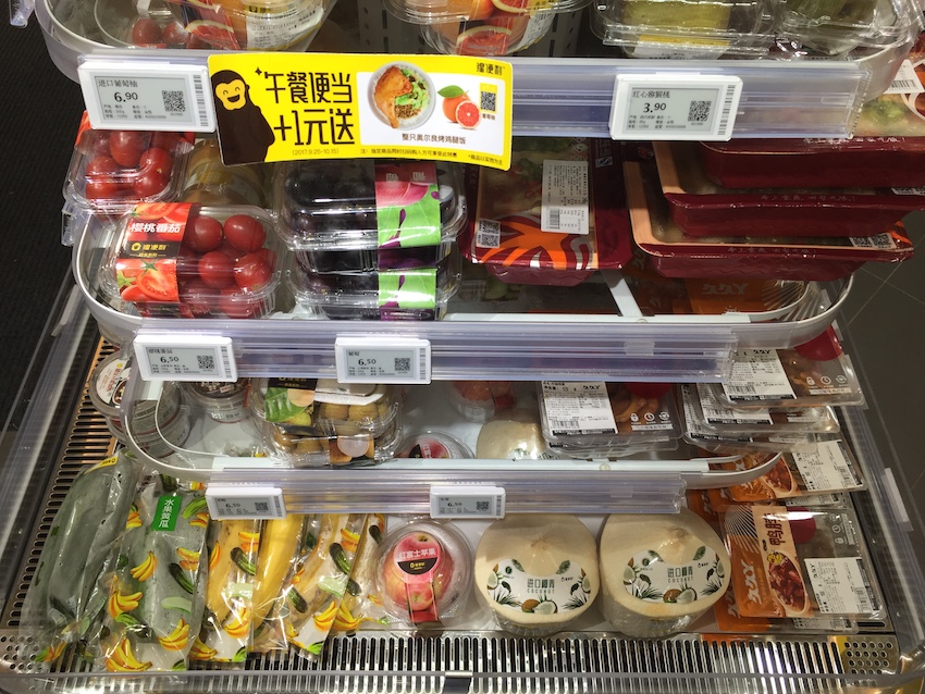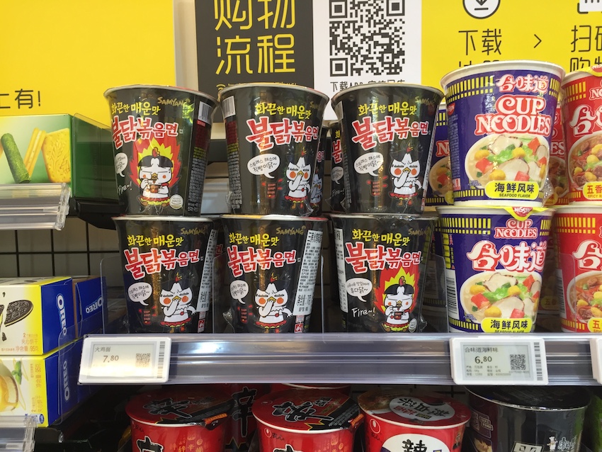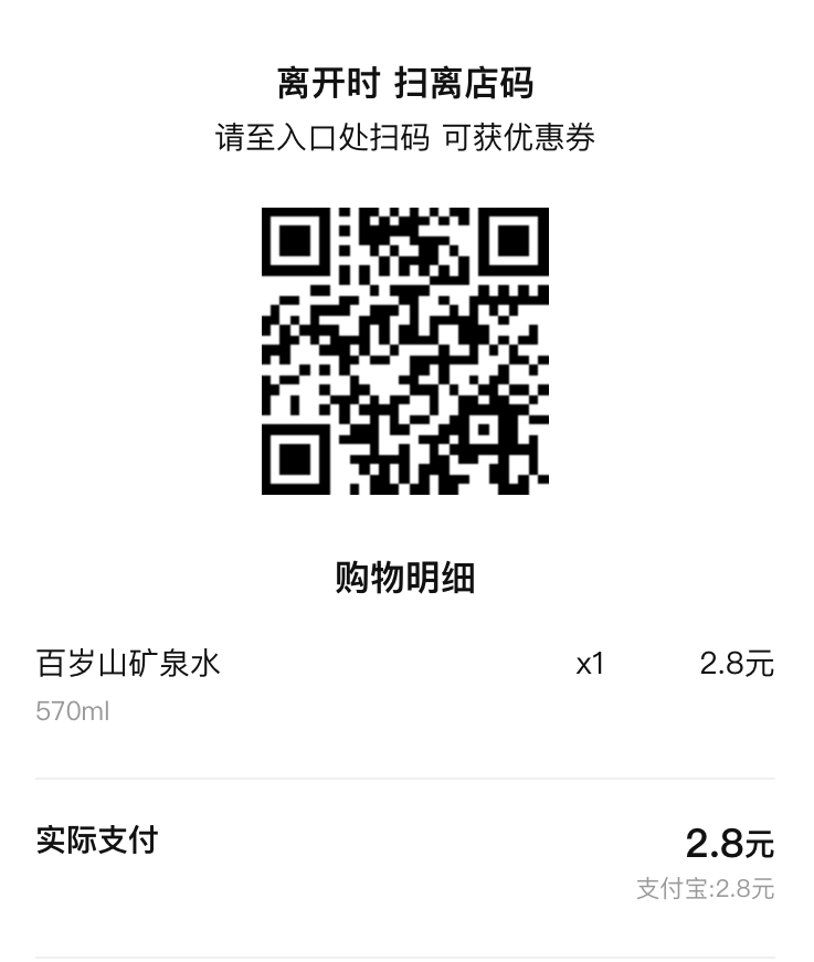 区别于传统便利店,要在这里购物,消费者必须带上手机、ipad之类的移动终端。因为这家以黄色为基础色调的便利店里没有收银机,而且只能用支付宝或微信付款。整个购物过程里,都需要移动终端的支持:下载猩便利APP(店内有免费Wi-Fi)、扫描商品上的条形码、选择支付宝或微信付款,付款后获得一个二维码;离店时,在门口的机器上扫描这个二维码,就能离开了。