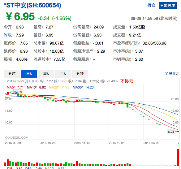 9月29日,多日跌停的*ST中安终于在开盘时打开跌停板并快速冲高,后大量卖盘涌入,公司股价再度逼近跌停,直至收盘*ST中安始终在跌停价附近维持低位震荡,收盘价报6.95元/股,跌4.66%。