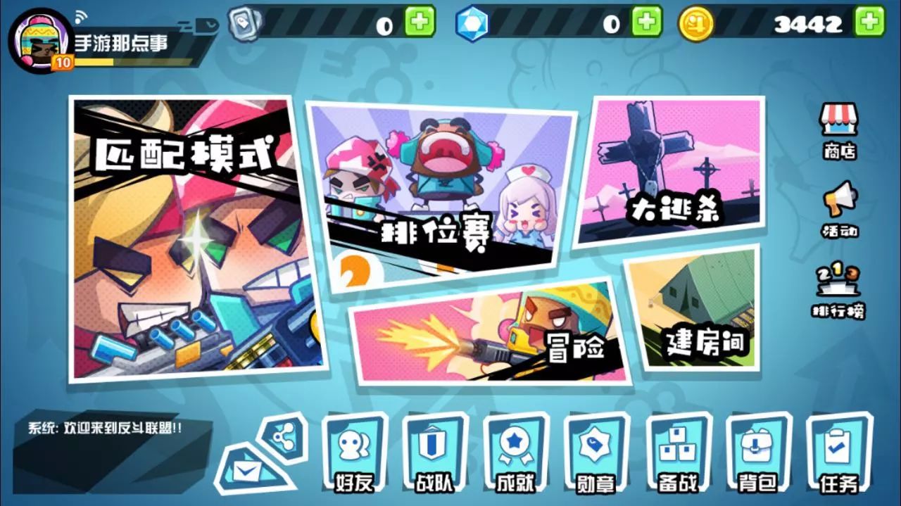 除了角色和武器的丰富之外,《反斗联盟》在玩法上也更加多样,“匹配”模式中,3V3的阵营,以“饥饿”模式为核心,击败对方可以获取积分,两分钟之间积分更高的一方获胜。“排位赛”模式则是以“夺宝”为核心内容,在地图中收集宝石,任意一方先收集到10个宝石并坚持15秒即可获胜。“冒险”模式则是在规定的时间内挑战自己一条命能击杀多少人。