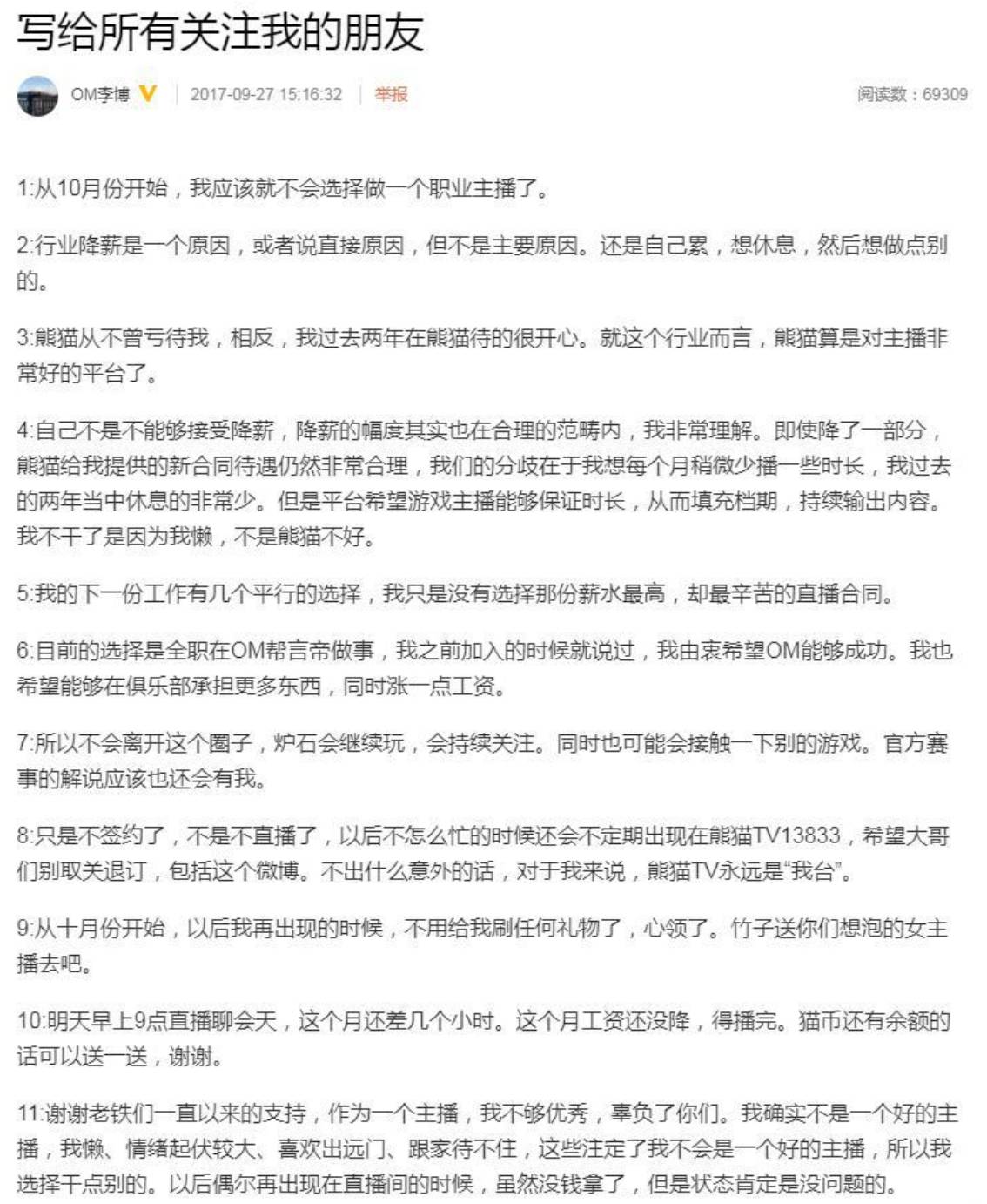 9月27日,知名炉石主播“天师”李博发文宣布:10月份开始将不再做职业主播,并对辞任理由直言不讳:“行业降薪是一个原因,或者说直接原因。”