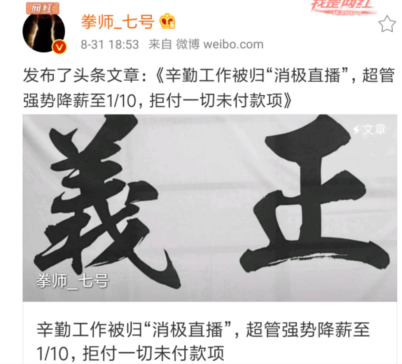 消息一出,拳师七号获各头部主播力挺,最后斗鱼确认降薪是某超管个人行为,薪酬按原数发放,算是息事宁人。只是有网友依然怀疑,该超管是为平台背锅。只是如何给主播降薪,平台也还没想到好的处理方法。