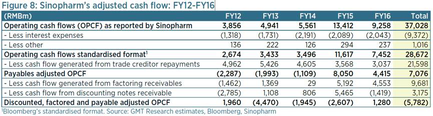 国药控股辩称,由于其银行正直接偿还其贸易债权人,实际上,这些偿还应该被视为一种融资,而不是一种经营活动。通常情况下,来自供应商的货物销售会产生现金流入,而偿还则会造成资金外流。通过以这种方式重新划分某些债权人的还款,中国国药控股对其营运现金流有实质性的夸大。因此,在现金流量表中,应付账款和债务的变化与资产负债表上报告的变化不一致。
