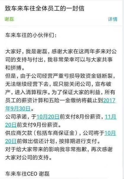 昨天晚上,二手车交易平台车来车往CEO谢磊在公司内部邮箱群发了邮件,告知员工公司将进入破产清算程序,原因是公司严重亏损、资金链断裂而无法继续经营。