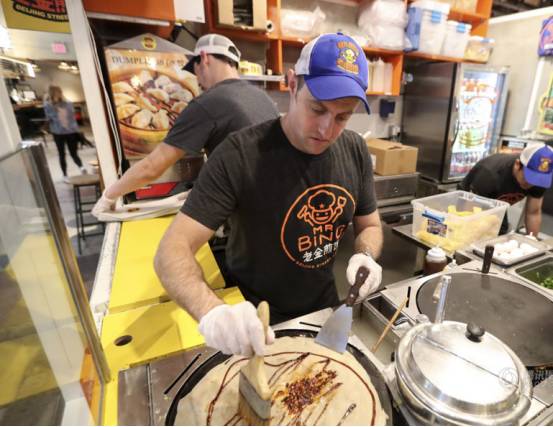 煎饼果子是为数不多的中国美食火到美国的,很多白人都喜欢吃这种美食,不光是美国华人在做,就连一些去过中国的白人小伙也在做,并且在法拉盛、华尔街的餐车上,煎饼果子也受到了民众的追捧,尤其是那种融入了美国元素的煎饼果子,还加入了鸭肉等材料,用料豪华当然价格不菲,豪华版要卖到15刀一个。价格比汉堡包要贵的多。卖煎饼果子的白人小伙说,相信越来越多的人会喜欢上这种食物,墨西哥卷刚刚登陆美国的时候美国人也很陌生,但是现在也是吃的津津有味。