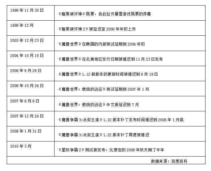 其次,游戏高质量的前提是极高的开发成本。暴雪虽有“暴雪出品必属精品”之称,却也是众所周知的“跳票之王”。基于对产品的一丝不苟,暴雪的跳票历史也是众所周知。从1996年的《暗黑破坏神》开始,暴雪游戏就开启其跳票之路。