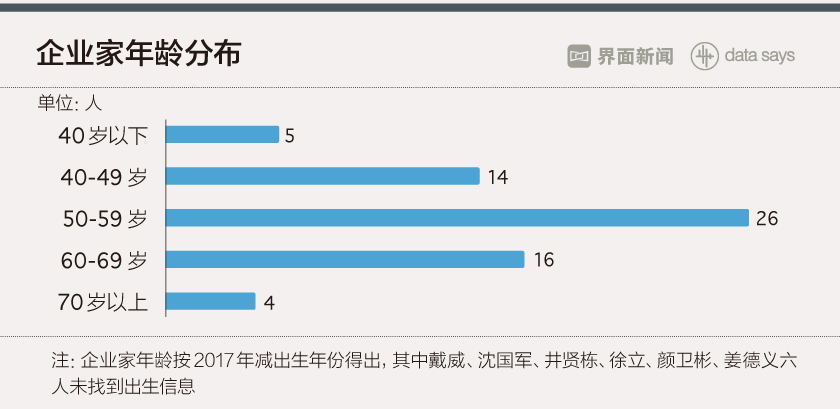从企业家回复《意见》的速度来看,海尔集团首席执行官张瑞敏、奇虎360公司董事长周鸿祎、万向集团董事长鲁冠球、中国建材集团有限公司董事长宋志平、浪潮集团董事长孙丕恕响应速度较快。而从企业家年龄来看,73%都年过50岁,年龄最大的是南德集团前董事长牟其中,现已76岁。40岁以下的中青年企业家只占7%,分别为39岁的猎豹移动公司CEO傅盛、38岁的沪江董事长伏彩瑞、35岁的摩拜单车总裁胡玮炜、34岁的滴滴出行CEO程维、32岁的51Talk无忧英语CEO黄佳佳。从企业家所属行业上看,分布于商务服务业的企业数量最多,而近年备受关注的房地产业,本次有8位企业家表态,占比11.3%。