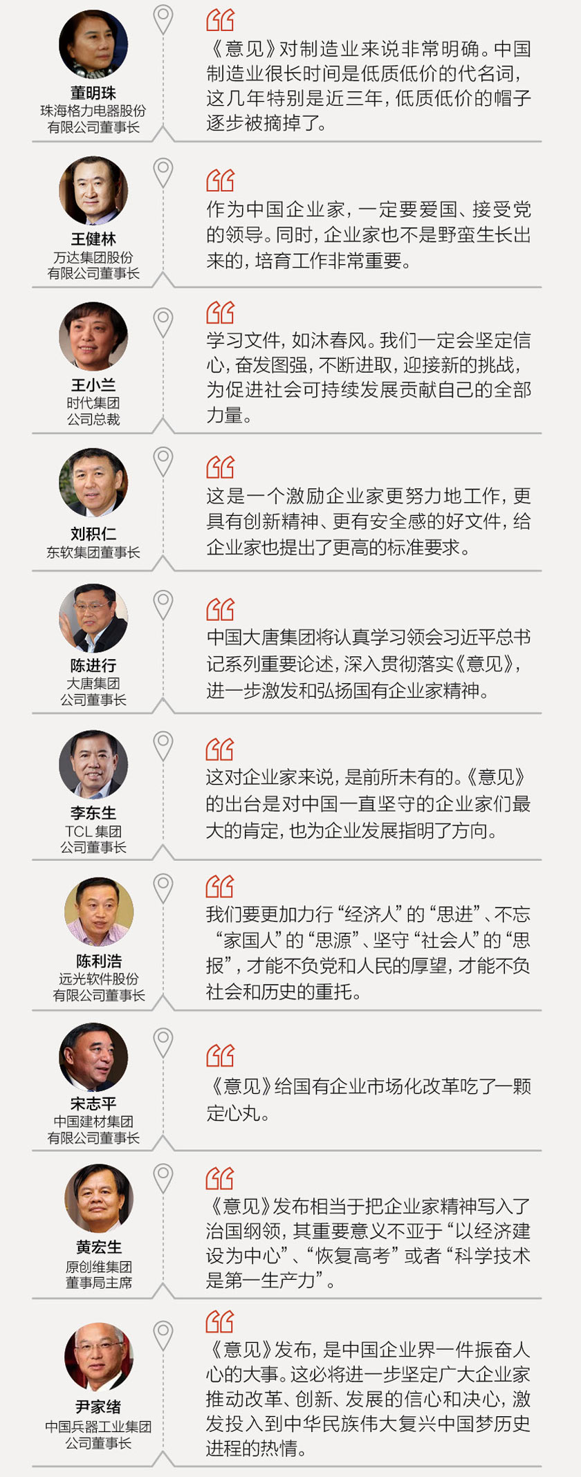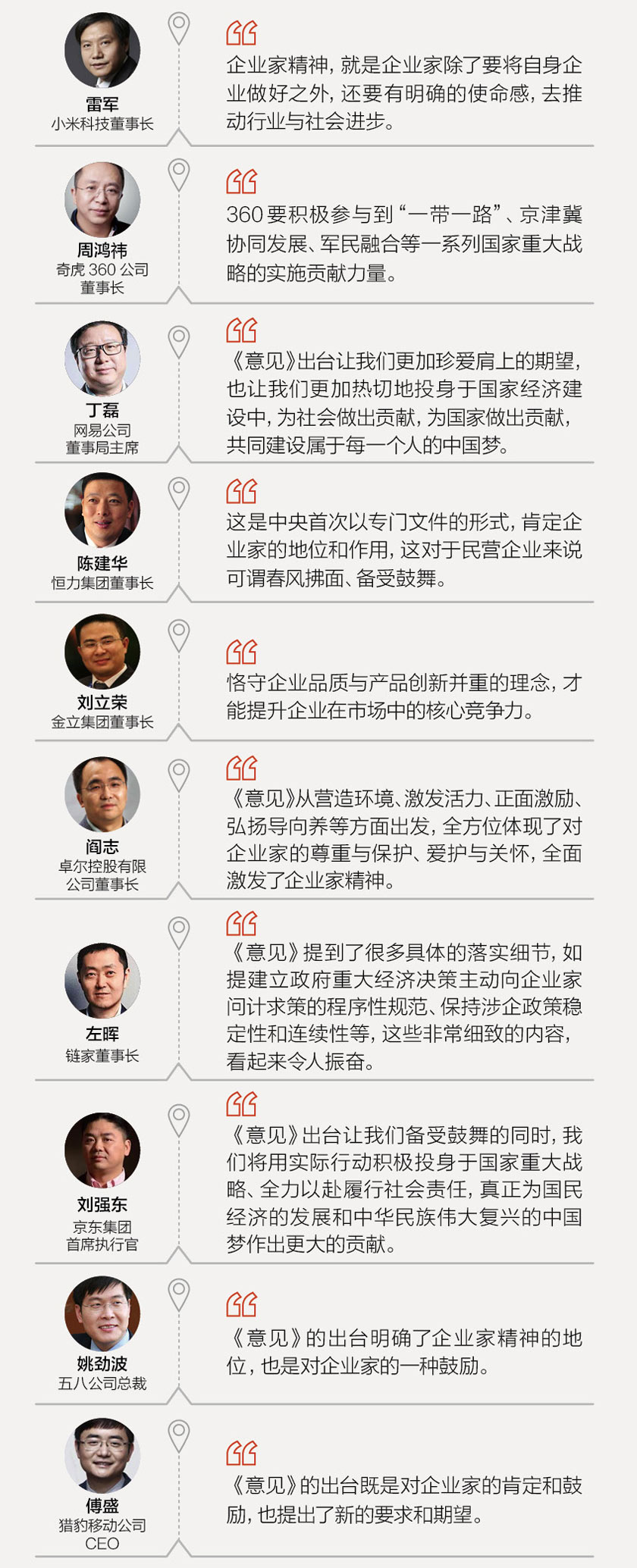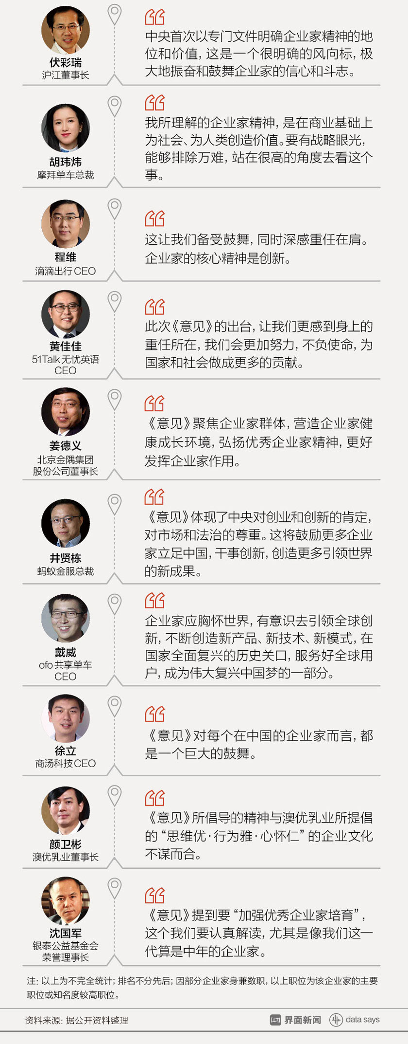 2017年9月25日,由中共中央、国务院印发,中国首个聚焦企业家精神的文件《中共中央国务院关于营造企业家健康成长环境弘扬优秀企业家精神更好发挥企业家作用的意见》(简称《意见》)发布。据界面新闻记者统计,自《意见》发布至9月30日08时,已有71名企业家就《意见》发表言论。