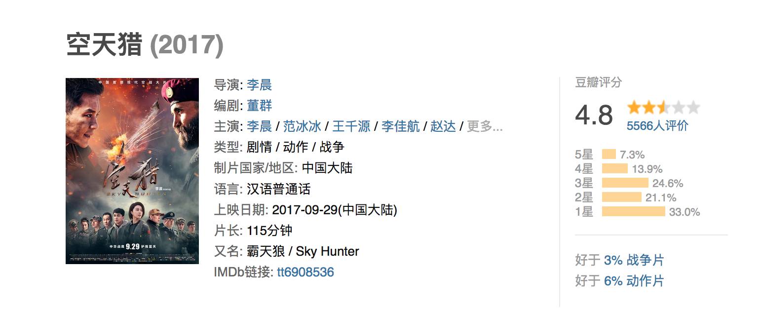 但是在豆瓣评分上,《空天猎》仅仅好于“暂未评分”的《极致追击》,在4.3分—4.8分之间徘徊。这显然是毫无辩白余地的差片得分。
