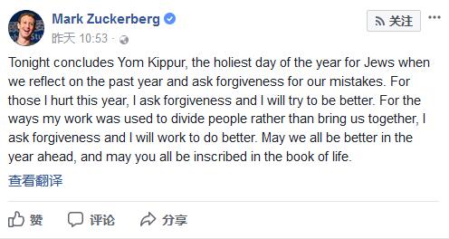 周六晚,在犹太人一年中最庄严最神圣的赎罪日即将结束之际,Facebook创始人兼首席执行官马克·扎克伯格在其个人Facebook页面上为自己的事业被用来分裂人们而道歉。