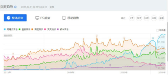 数据是最好的证据。在知乎上,有网友用百度指数(百度指数能反映一个品牌的用户关注度,并能大致反映出一款产品的发展势头)来分析了网易云音乐是如何一步步赶超除了QQ音乐和酷狗音乐的。
