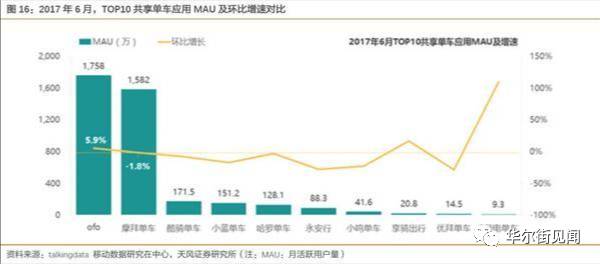 天风证券6月底的一份报告显示,截止2017年6月,在月活跃用户量(MAU)上,ofo小黄车、摩拜分别达到1758万、1582万,二者体量均远远超过第3-10名共享单车APP之总和。