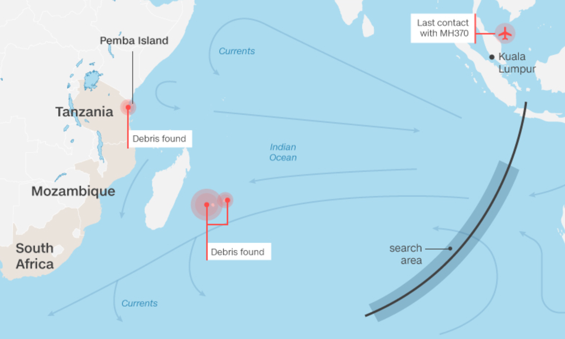 在过去两年中,部分MH370航班的残骸被冲上非洲东岸。马来西亚交通部长廖中莱今年2月证实已经发现了27块飞机残骸,今年年底马来西亚将出具一份MH370航班的最终报告。据BBC报道,目前马来西亚方面主导的搜索工作仍在进行中。