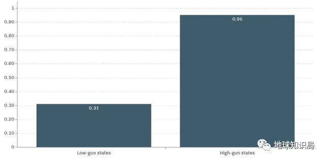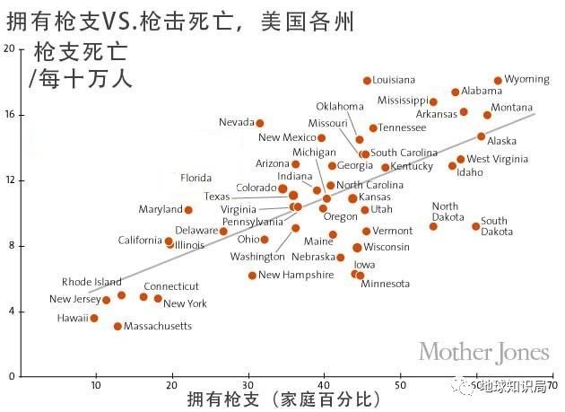 引用“小儿科”与“疾病控制防御中心”的数据,琼斯妈妈与上面的图表拿来对比,发现枪支保有量越多的州,枪杀案也呈现越高的趋势。