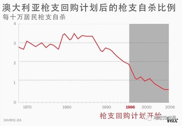 当一个国家限制了枪支的获取,其枪击自杀数也戏剧性地减少了。上述澳大利亚研究机构的数据表明,澳大利亚政府通过控制枪支买卖降低了接近五分之一的自杀数。