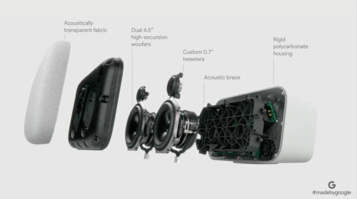 Google Home Max 配备了两个 4.5 寸的低音单体喇叭、两个高音单体喇叭,这些喇叭给 Google Home Max 提供了普通 Google Home“20 倍”的音量输出,这甚至比苹果之前发布的专为音乐而生的 HomePod 还要强力。