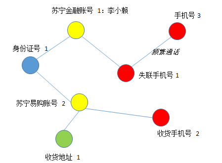 如上图所示,假设用户李小赖(化名)在苏宁金融有一笔贷款逾期,苏宁金融无法通过贷款账号对应的手机号1联系上李小赖,却可以通过李小赖登记的身份证号找到他在苏宁易购的账号和购买记录,将收货地址和收货手机号用于失联修复。另外,还可以利用运营商数据识别频繁联系的手机号作为扩展联系电话。