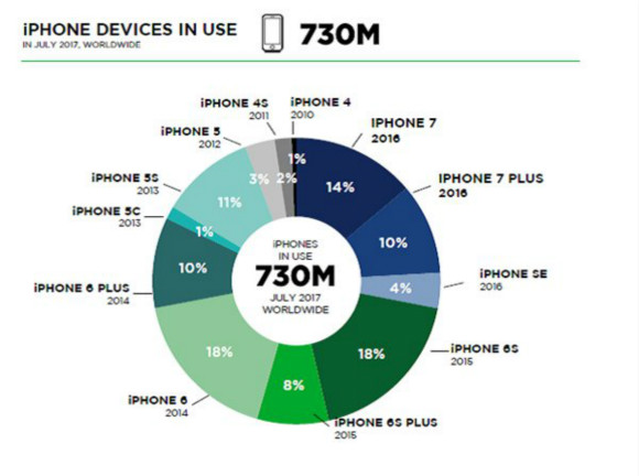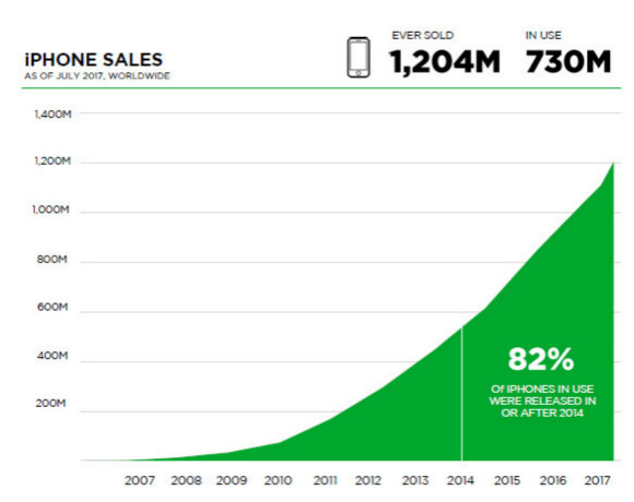 数据显示,2017年7月,全球有7.3亿部iPhone正在使用中,占全球人口的1/10。根据苹果的财报,截至到2017年6月,苹果已经销售12亿部iPhone。这意味着,过去十年苹果销售的iPhone中,2/3仍在使用中。