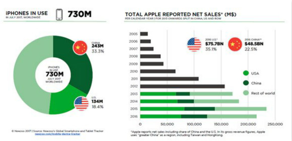 中国仍然是iPhone的最大市场,2017年7月,中国有2.43亿iPhone用户,占33.3%。美国排在第二位,iPhone用户数量1.34亿,占18.4%。