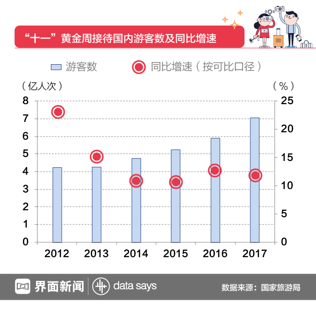2017年国庆假期,中国接待国内游客数和国内旅游收入同比增速均出现回落。
