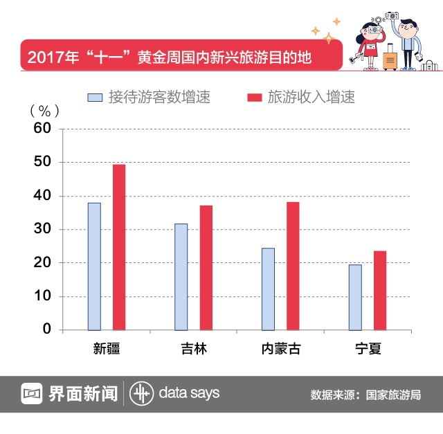 假日期间,湖南、贵州、江西等热点省份人气持续火爆,旅游收入继续增长。同时,内蒙古、新疆等新兴旅游目的地的接待游客数和旅游收入也出现快速增长,其中,新疆接待游客数和旅游收入增长最快,分别达38.2%和49.6%。