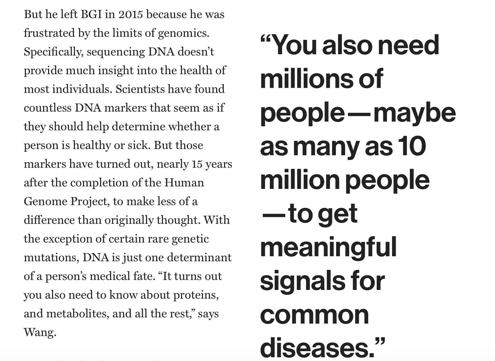 但是2015年,王俊离开了华大基因,这源自他对基因组学技术局限性的沮丧。 具体来说,仅仅通过DNA测序,并不能很好地了解大多数人的健康状况。科学家们认为,这些数不尽的DNA标记,似乎可以帮助确定一个人健康与否。
