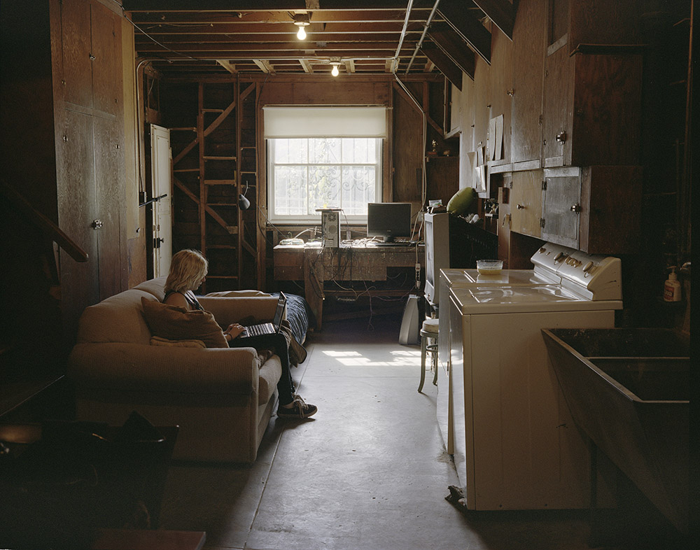 一个女人住在自家简陋的车库中,楼上的其他房间则租给了别人,这样才不至于入不敷出。