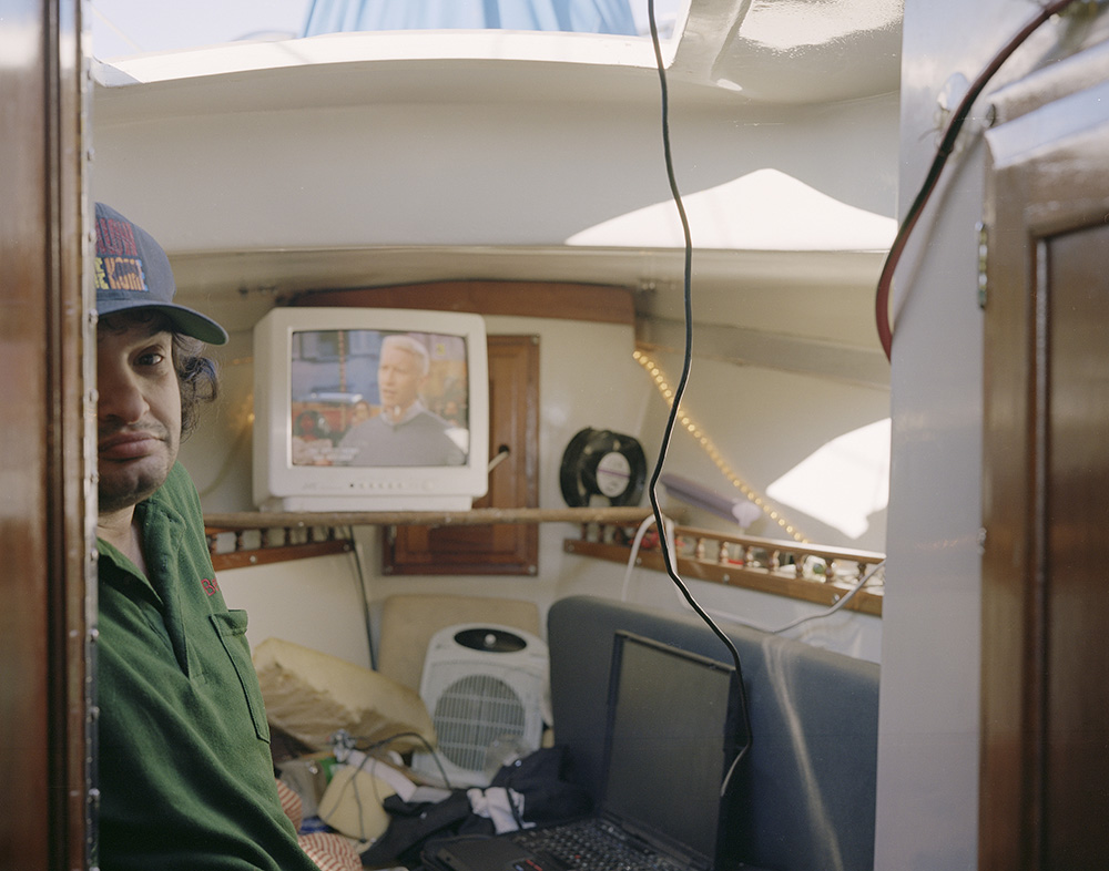 男人居住在小船上,而他的所有家当也堆在这个小小的空间里。
