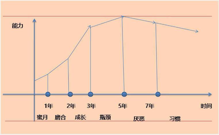 4. 其进入到习惯期,大多数人已经习惯呆着舒适区,不再愿意为公司付出努力,其结果就是工作能力因无法适应新环境变化而呈下降趋势。