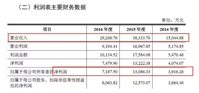 开心麻花IPO之路坎坷的问题与其有待考证的盈利能力不无关系。 就业绩而言,开心麻花最近三年(2014-2016年)的财报数据分别为:营业收入逾1.5亿元、3.8亿元、2.9亿元,其间对应净利润为逾3900万元、1.3亿元、7100万元。