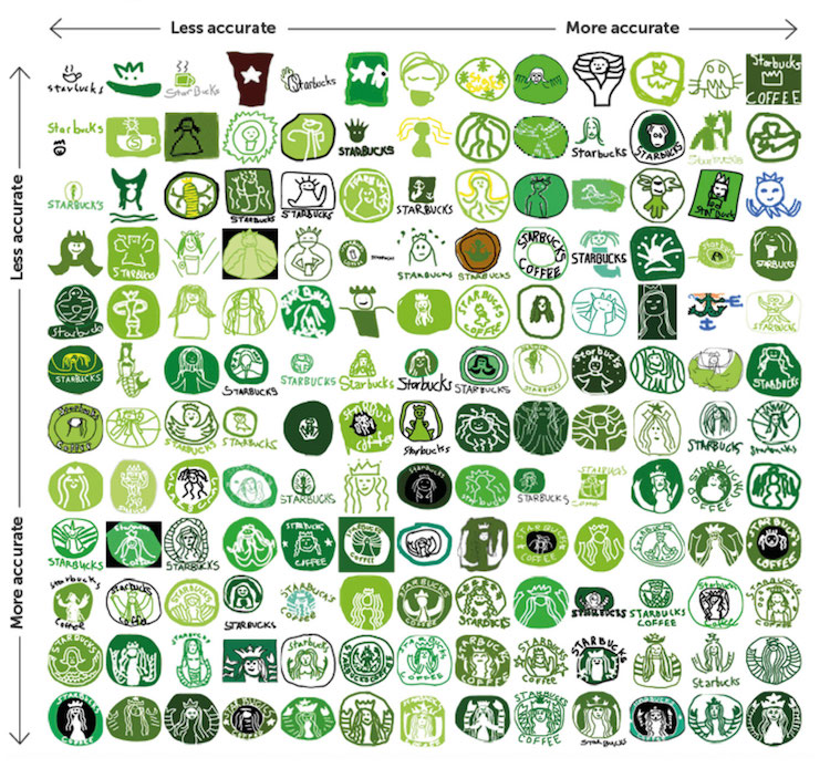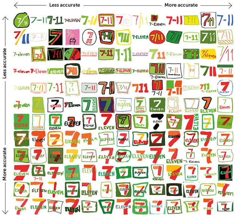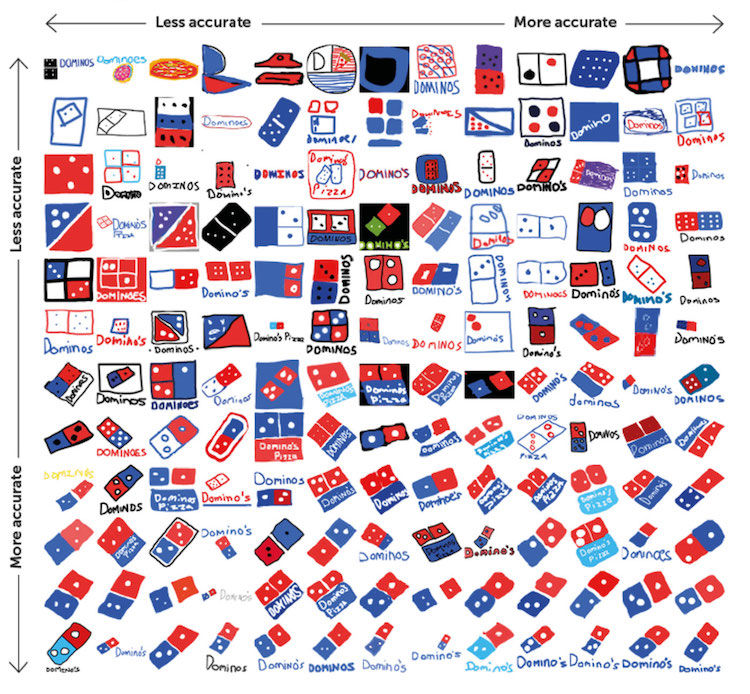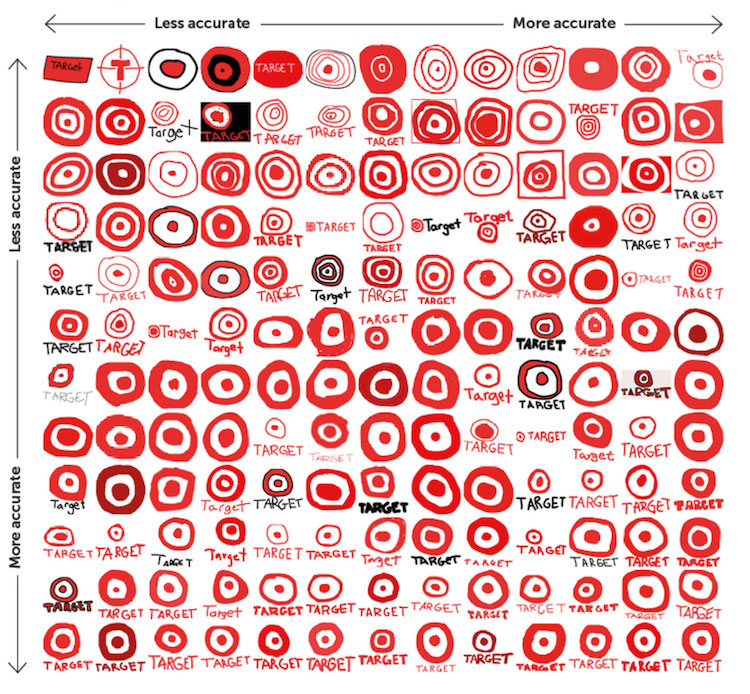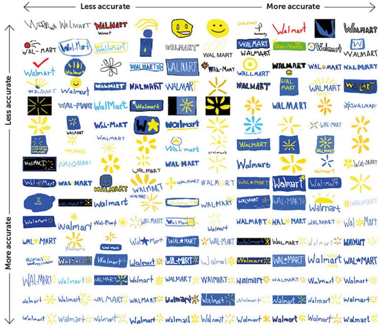 在参与者画完所有logo后,Signs.com把它们在表格中整理好,依照误差最小到偏差最大排列。和原logo差距最大的图案或是过于简化,或是画蛇添足。比如说,许多人给苹果logo添上了原本没有的果柄。其他人则给塔吉特的圆心加上了好些圆环,还有些人忘了把公司的名称加上去。人们在塔吉特上的表现比在Foot Locker和达美乐比萨上好得多,仅有不足半数人画对了这两个商标。
