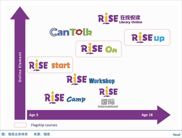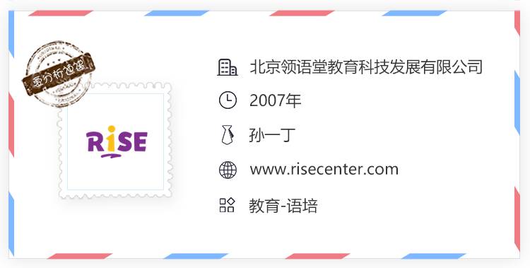 2007成立的瑞思学科英语,目前为3-18岁孩子提供课外英语培训服务,核心课程按照年龄段分为3类:面向3-5岁孩子的Rise start,面向6-12岁孩子的Rise on以及面向13-18岁孩子的Rise up;除核心课程外,还有Rise camp,Rise workshop,Rise国际和Rise在线悦读等产品作为补充。