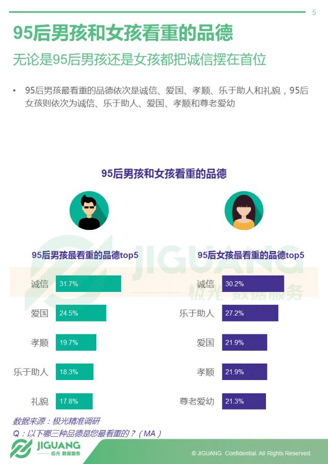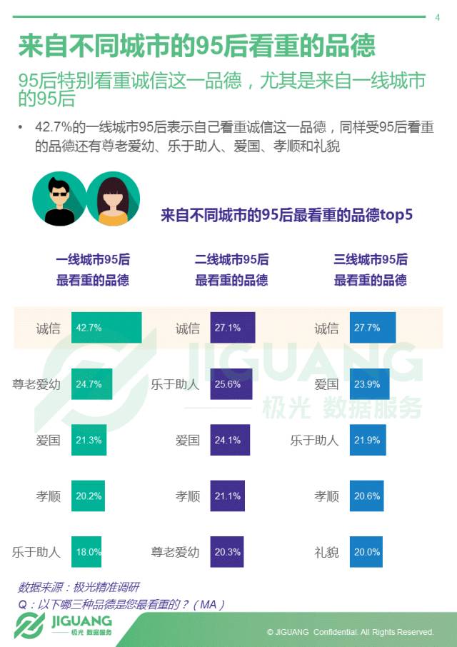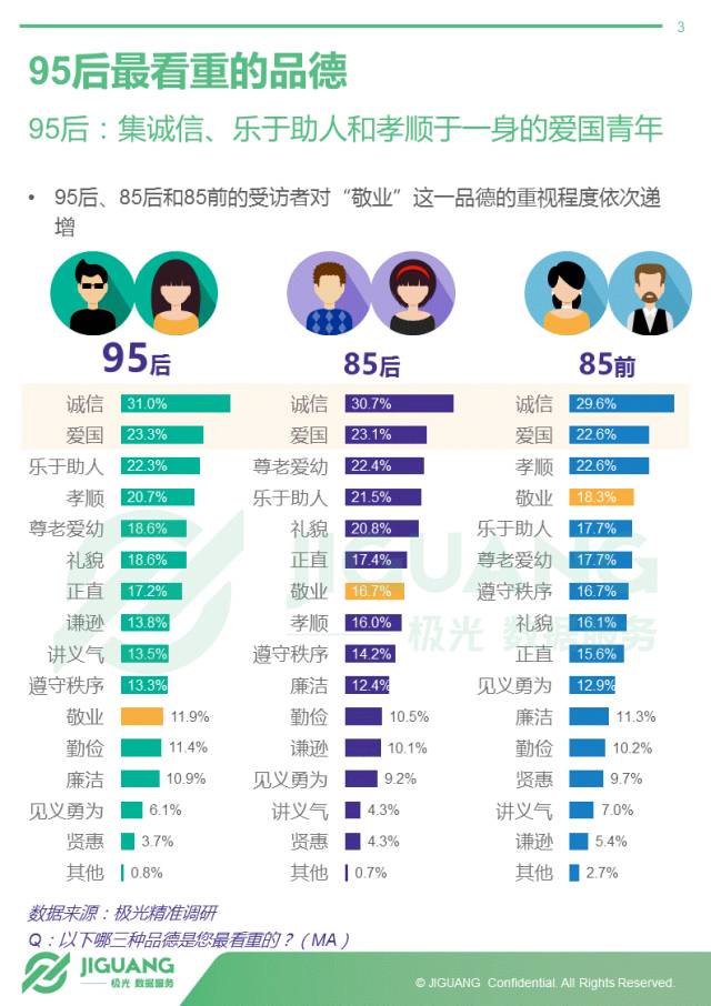 - 95后最看重的品德是诚信,爱国、尊老爱幼、孝顺、乐于助人等紧随其后