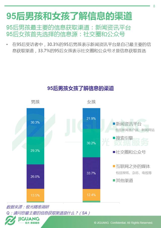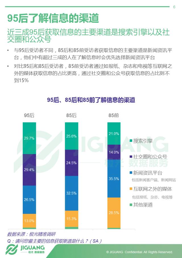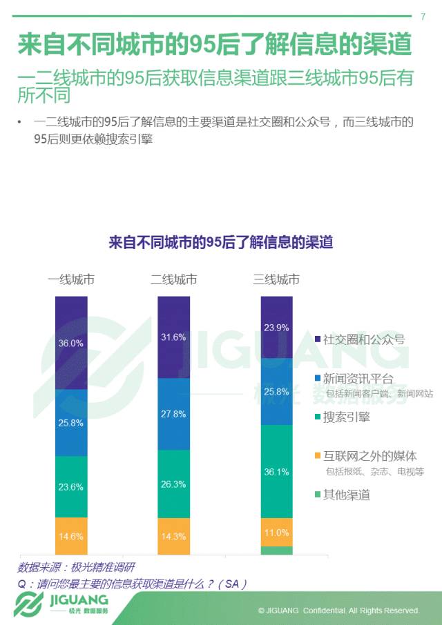 - 一二线城市95后依靠社交圈和公众号获取信息,三线城市95后则主要靠搜索引擎