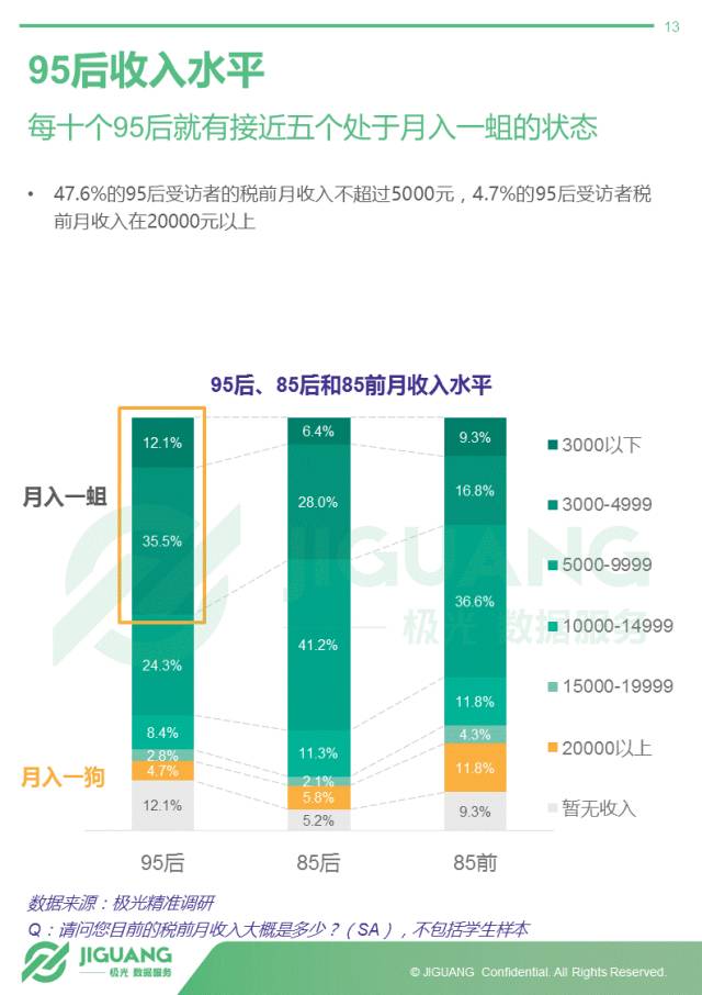 - 近半95后受访者处于月入一蛆(5000元)或以下的状态