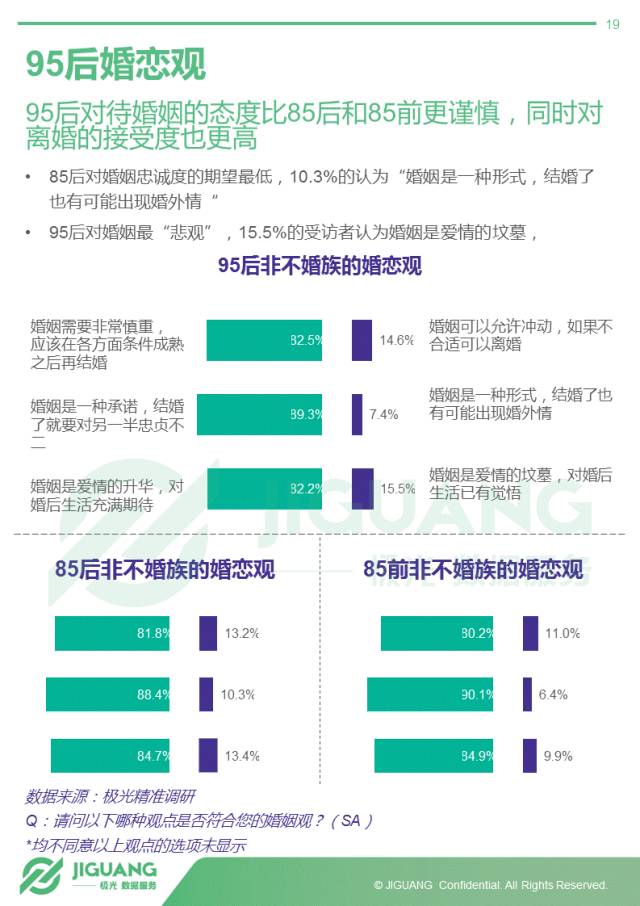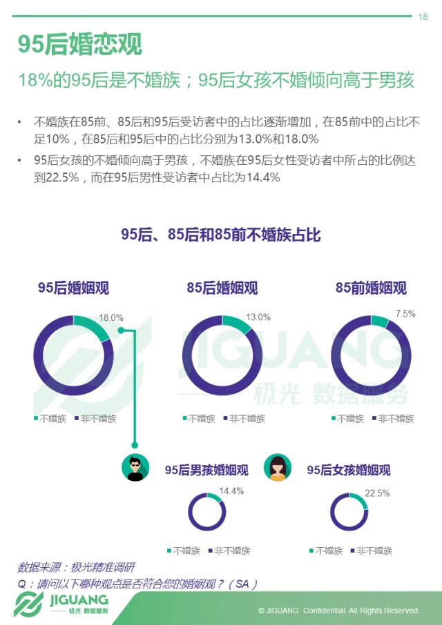 - 95后婚恋观更谨慎也更悲观,不婚族比例达到18%,女生更倾向于不婚