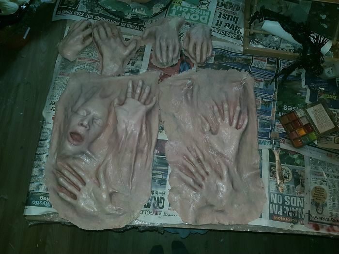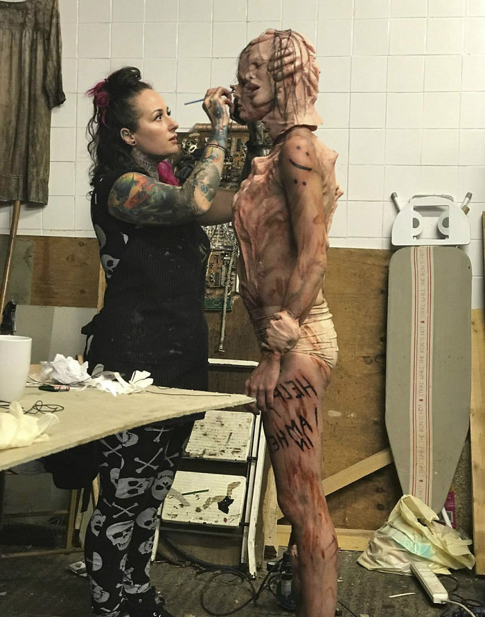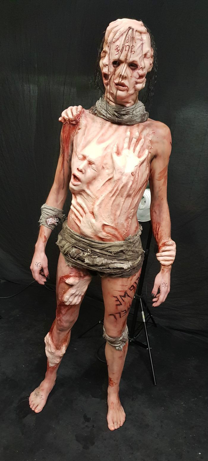 这些专业的照片是由Horrify me工作室的Rick Jones所拍摄的。我选择Rick的理由是因为其惊人的编辑技巧和对恐怖与细节的热爱,他在原有的妆效上增加了大量的假血,使整个画面变得更血腥可怕。助理Claire Jones花了6个小时把这些面具和身体碎片粘贴到模特身上,如果没有Claire的帮助,该设计的完工将花费更长的时间。而这个戴面具的想法也给大家提供了新的思考:我们中的许多人每天都藏在面具之下,我们用笑脸来掩饰我们生活中的痛苦和困难。这个设计很特别,希望能向每个受苦的人表示他们并不是一个人。只需说出你的感受,并与任意一个人交谈,你就会发现你们在某种程度上可能是同一类人,可以互相慰藉。