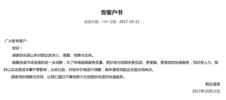 在韵达官网发布的《告客户书》写道,涨价的原因是“受人力、物料以及运营成本攀升等影响”,该理由与中通涨价理由一致。