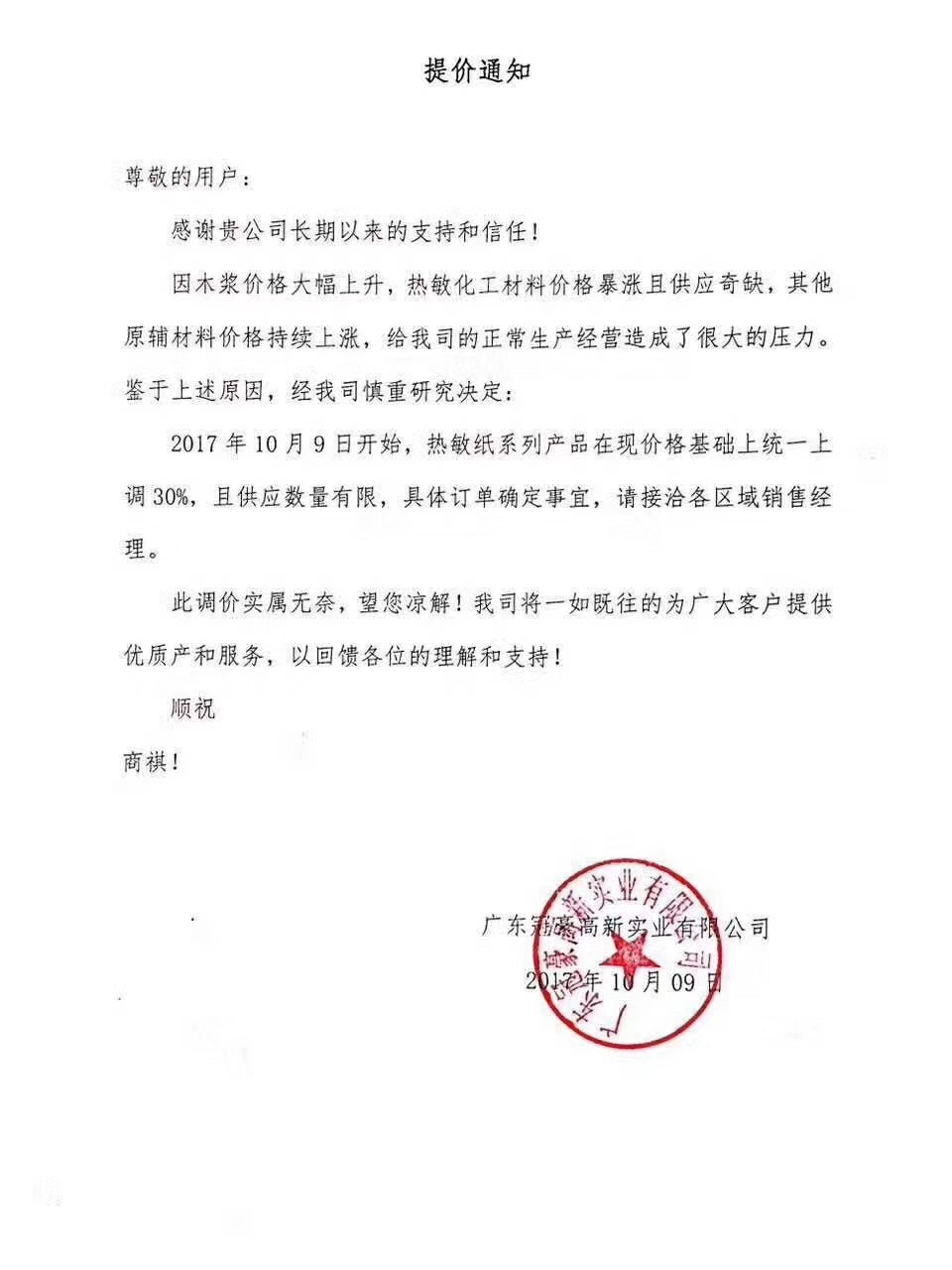 不仅是瓦楞纸,还有打印电子面单的热敏纸。一位上海的纸箱生产商对界面新闻记者表示,因木浆价格大幅上涨,热敏化工材料暴涨且供应奇缺,他的热敏纸供应商将热敏纸价格上涨了30%,且供应数量有限。