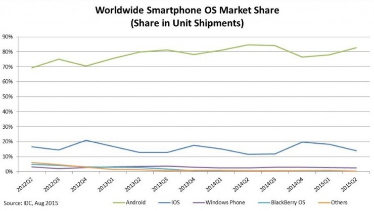 下面两张图是同样来自 IDC 的一组数据,它分别记录了智能手机高速发展的那段黄金时期以及近两年时间里,各个主流智能手机操作系统的市场份额变化。