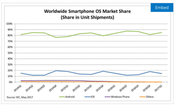Joe Belfiore 所说的“用户太少”,的确是事实。根据市场调研机构 IDC 公布的 2017 年 Q1 智能手机市场报告,Windows Phone 在全球范围内只有 0.1% 的市场份额。此前在 2016 年的预测中,IDC 曾认为 Windows Phone 的份额会在 2020 年达到 0.1%;没想到,微软提前 3 年走到这一悲惨的境地。