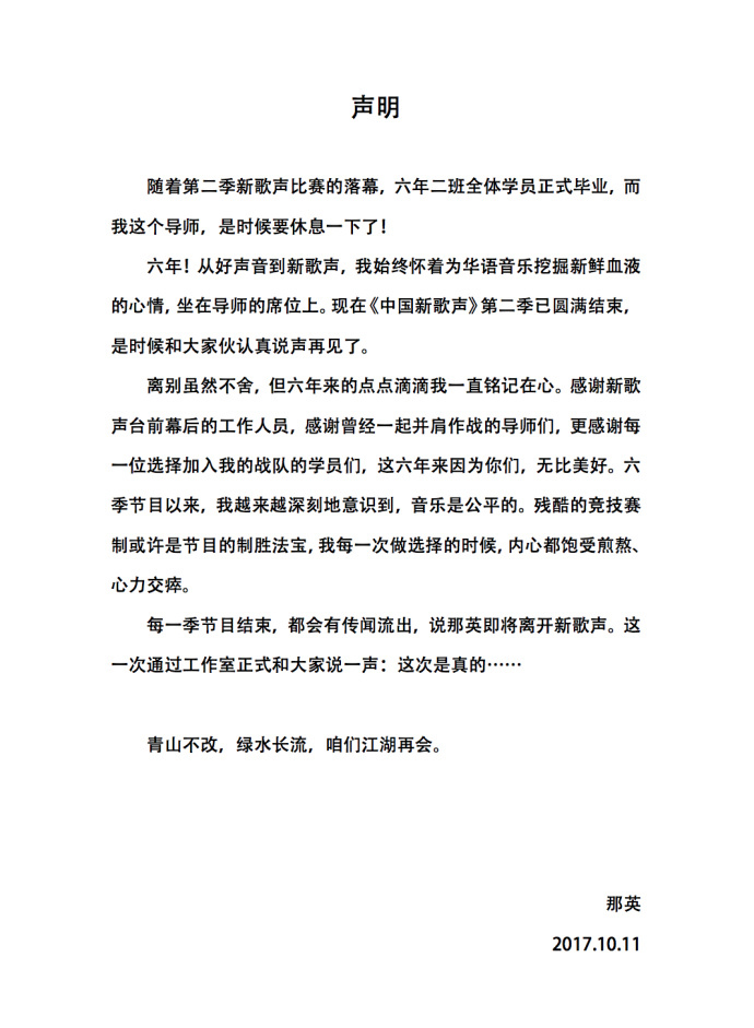 10月11日,那英工作室发布声明,称那英宣布将不再参与后续《中国新歌声》节目录制。声明中,那英表示,对节目和学员非常不舍,对竞技赛制必须做出选择也感到煎熬和无奈,对于音乐,自己也有不为人知的执着。但是她还是毅然做出决定,是时候和大家认真说声再见了。