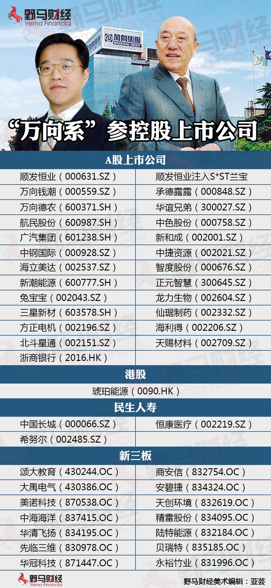 迄今为止,“万向系”至少掌握了万向钱潮(000559.SZ)、承德露露(000848.SZ)、万向德农(600371.SH)、顺发恒业(000631.SZ)等4家上市公司控制权,并参股了华谊兄弟(300027.SZ)、广汽集团(601238.SH)、新和成(002001.SZ)等18家A股、港股公司;布局有颂大教育(430244.OC)、商安信(832754.OC)等14家新三板挂牌公司;金融方面,则取得了除券商之外的几乎所有金融牌照。