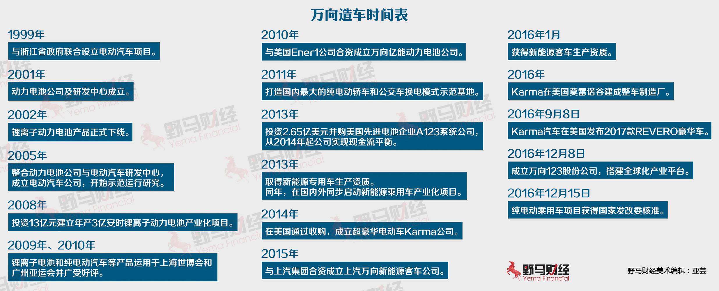 2010年,万向集团与美国Ener1公司合资,在杭州建立全自动化电芯及电池生产基地;2012年,万向集团以2.566亿美元价格收购了美国最大新能源电池制造商A123公司;2014年,收购美国菲斯科,并成立超豪华电动车Karma公司。