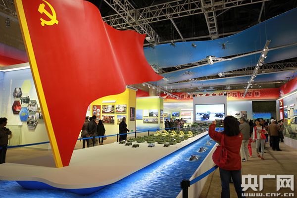 “这是‘强军征程 扬帆远航’主题模型站台。”跟随着讲解员的指引,展现在人们眼前的是50型151件武器装备模型。讲解员介绍到,展台形似船帆的党旗寓意着在党的领导下朝着建设世界一流军队杨帆远航。2016年12月2日至3日,习近平总书记出席中央军委军队规模结构和力量编成改革工作会议,号召全军扎实推进军队规模和力量编成改革,这轮改革,使全军现役员额将由230万减至200万,18个陆军集团军调整组为13个。