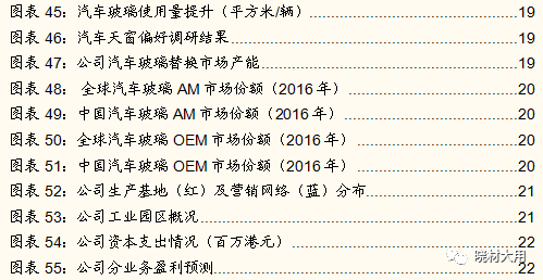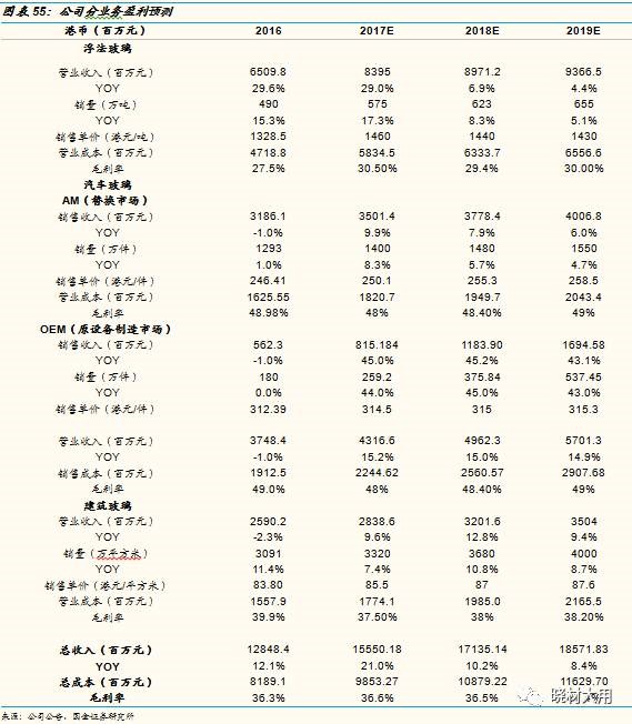 3、公司未来将着力开拓整车玻璃市场。目前公司汽车玻璃专注于汽车后市场,从销量来看,在全球汽车维修市场市占率高达25%,是国内汽车维修市场的玻璃龙头,预计2017年公司汽车玻璃产能将达1640万件/年,产能稳步扩张。目前国内整车市场主要被信义及福耀所垄断,两者合计市占率90%左右,其中公司占比约20%,而在全球整车市场汽车玻璃中的份额不足1.5%,未来公司将积极拓展整车市场,计划到2020年市场份额提高到6%左右。