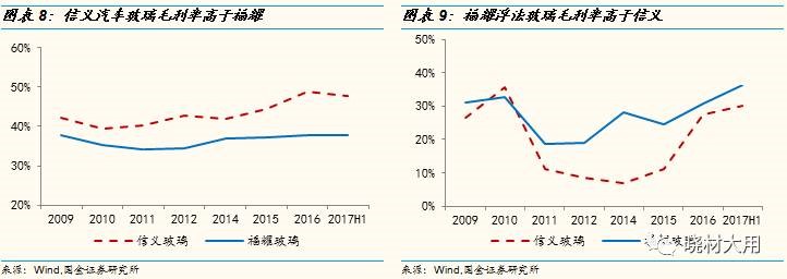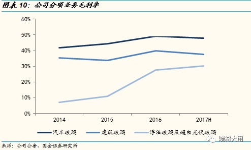 从细分板块看,公司汽车玻璃板块盈利最为亮眼,近两年毛利率维持在48%左右,同板块福耀玻璃毛利率为38%;浮法玻璃板块公司毛利率约为30%,比福耀玻璃低6%左右。福耀玻璃总体毛利率在公司之上的原因是福耀在汽车板块收入占比远高于公司。