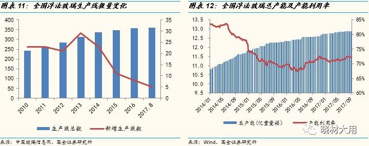 行业新增产能速度放缓,短期将维持平稳状态。从2013年开始,我国浮法玻璃新增产能逐步下滑,2016年新点火生产线仅8条,相比于2013年的增加量29条大幅减缓,产能同比增速降至3.2%。目前国内共计361条生产线,日熔量为21.47万吨/天,其中在产产能15.47万吨/天,产能利用率仅为72%左右,较2014年高点下滑12个百分点。我们认为,产能利用率下降的主要原因在于过去两年大量生产线由于经营亏损而进入停产状态,包括2014年冷修停产生产线38条(共计日熔量21950吨/天)以及2015年冷修停产43条(共计产能24390吨/天),截至目前生产线复产的比例较低,随着环保逐步趋严,对于一些小企业复产压力仍比较大,预计短期内供给仍将维持稳定。