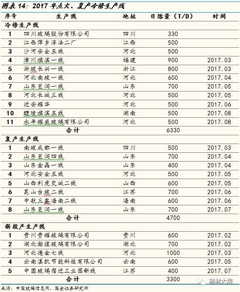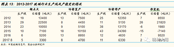 截止2017年前8个月,全国新投产生产线5条,复产生产线8条,冷修停产生产线11条,在产产能净增加1670吨/天,产能略有上升。预计在产产能短期内将持续处于低速增长阶段,供给端整体保持稳定状态。