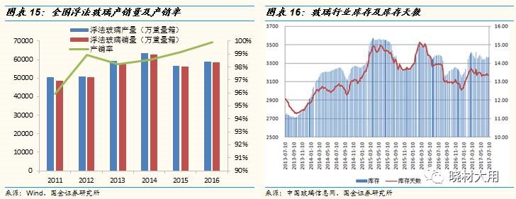 浮法玻璃产销平衡,产销率维持在98%以上。2016年全年国内浮法玻璃产量为58754万重箱,销量58695万重箱,产销率达到99.9%,行业需求有一定支撑。目前来看,行业库存为3223万重量箱,处于历史中游水平,短期来看,企业间库存压力不大。